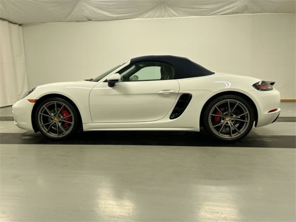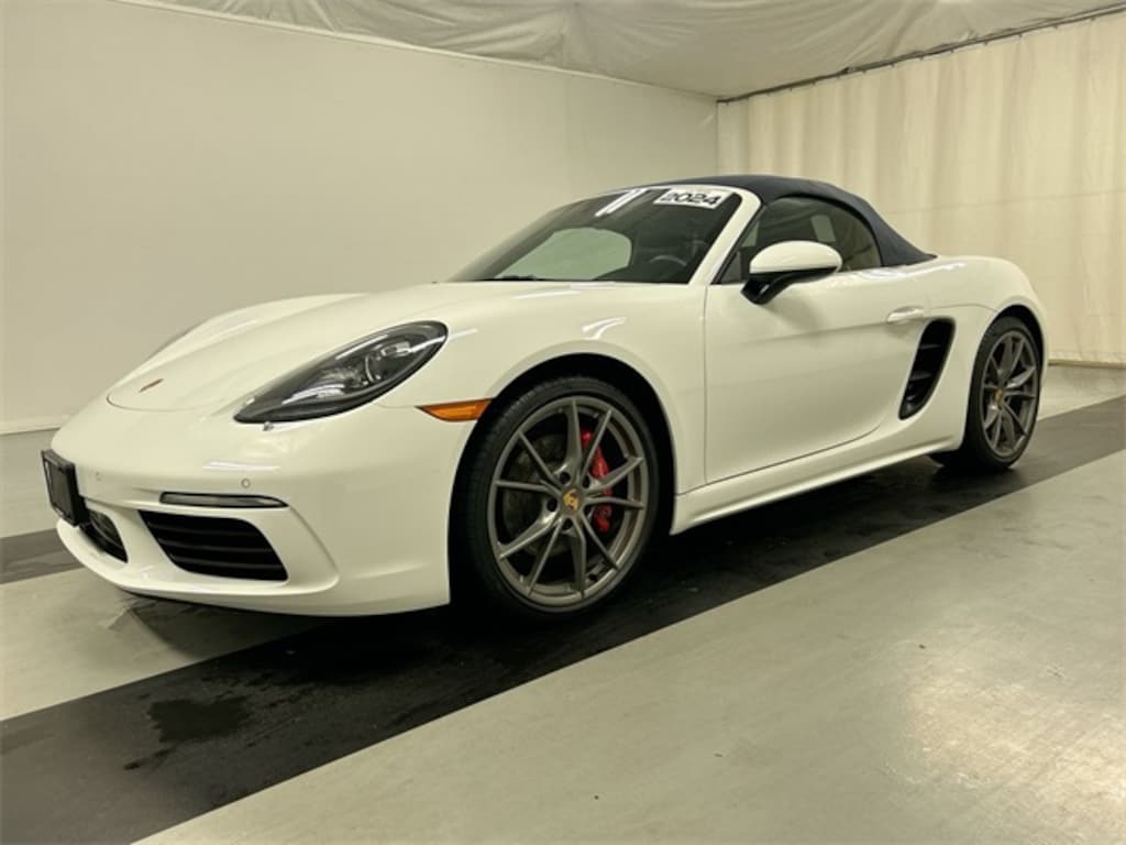Certified. White 2024 Porsche 718 Boxster S RWD 6-Speed Manual 2.5L H4 Turbocharged DOHC 16V LEV3-LEV160 350hp Supplemental Safety Bars in Exterior Color, Rear Wing in High Gloss Black, Deletion of Model Designation on Rear, Wheels Painted in Satin Platinum, 20" Carrera S Wheels, Interior Trim Painted in Exterior Color i.c.w. Standard Interior, Smartphone Compartment, BOSE Surround Sound-System, Factory Warranty Start Date: 03-29-2024, Electrically Folding Exterior Mirrors w/Lighting, Front Seat Ventilation, Lane Change Assist (LCA), Light Design Package, Luggage Net in Passenger Footwell, Porsche Entry & Drive, Premium Package, Sport Chrono Package.